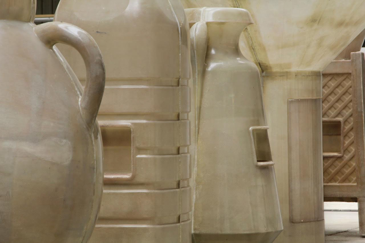 Farid’s ongoing project, In Lieu of What Was (2019), is comprised of 5 fiberglass and resin water-vessel sculptures presented in a single file. The composition is an allusion to Sumerian art that recalls an impression left by a cylinder seal when looked at from the side. The sculptures, petrified and fragile in their appearance, are 1:1 scale casts of drinking fountains that can be seen dotted across the Arabian Gulf where Farid has been developing work since 2014 that examines the history of water in the region—its scarcity and abundance—as well as its role in economic development and destruction of communities and ecosystems.